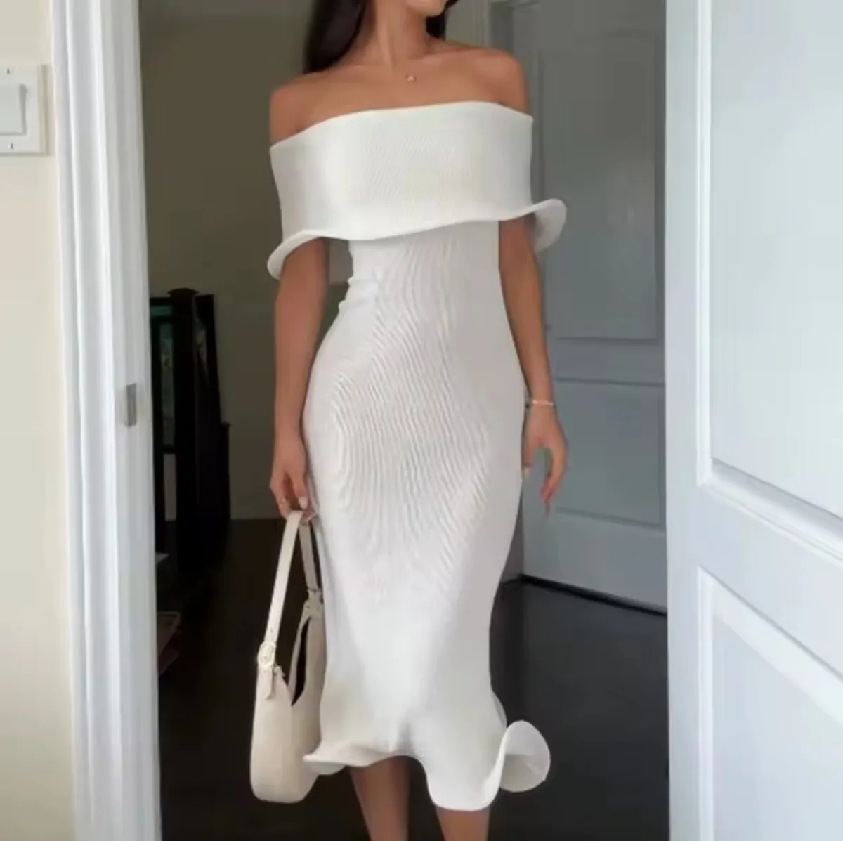 فستان نسائي متوسط الطول بحافة اللوتس احادية اللون